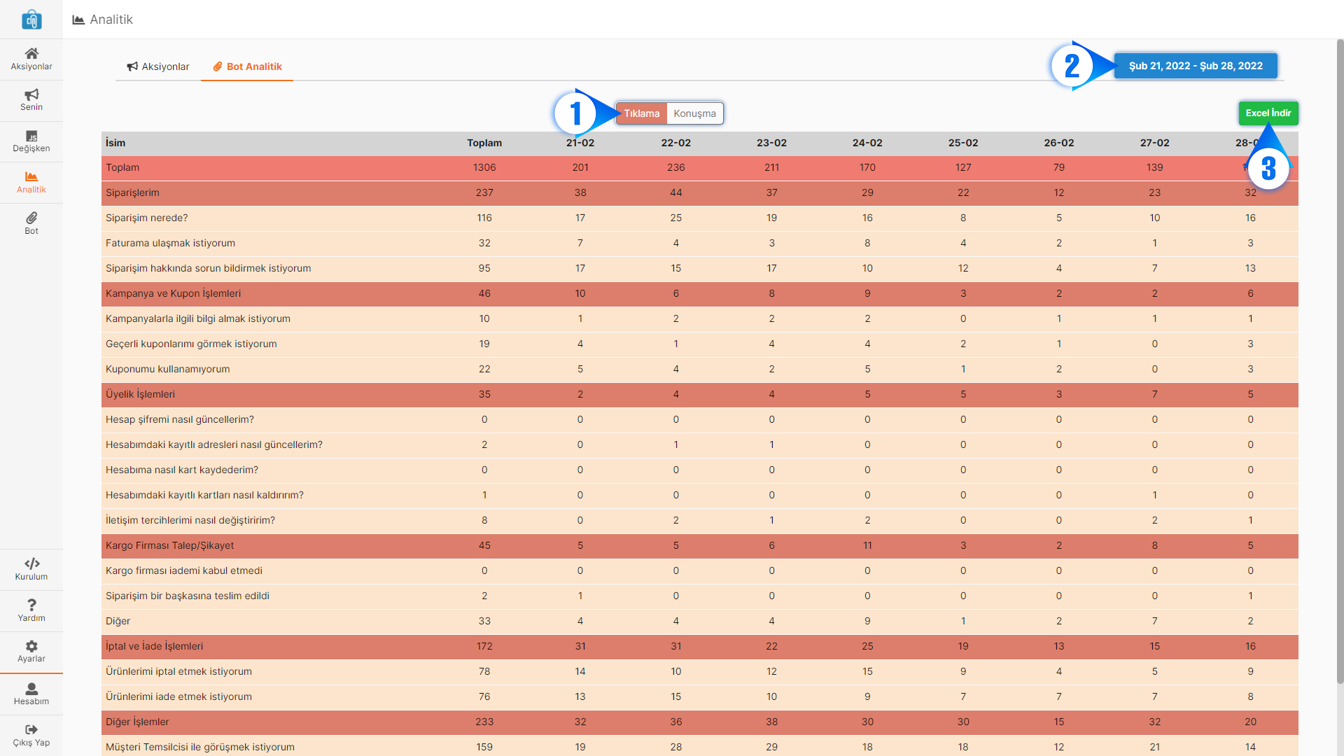 You can access the analytics of the categories and actions you have created on the bot analytics page on a daily basis. You can view separate data for actions based on conversation or click status.